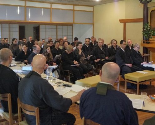 Minamizawa Roshi, le fondateur de Kanshoji, est une source d’inspiration pour nous, quand on voit l’énergie qu’il déploie à 90 ans pour faire connaître la pratique de Bouddha dans le monde. Notre pratique de bodhisattva est bien sûr de nous éveiller, mais aussi d’aider toutes les existences à s’éveiller.